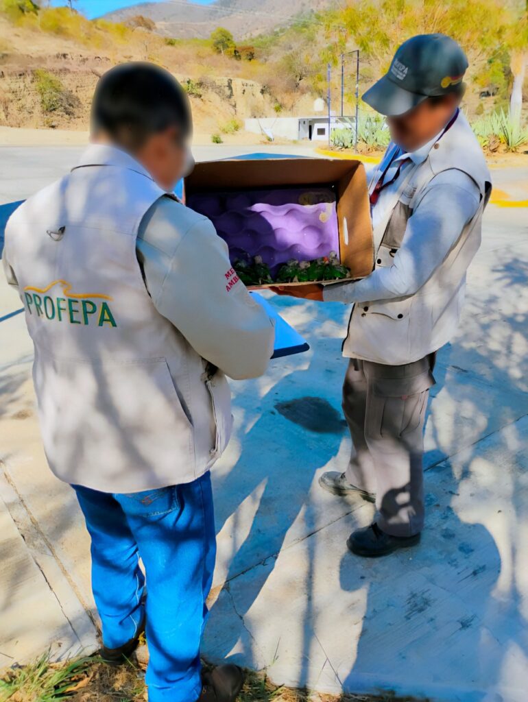 En un recorrido por el lugar citado y en colaboración con elementos de la policía estatal de Oaxaca, el pasado 11 de abril, inspectores de la Profepa solicitaron al encargado acreditar la legal procedencia de los psitácidos; al no hacerlo, hicieron el aseguramiento precautorio de las crías.