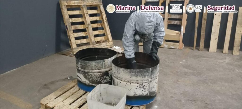 Durante la ejecución de las órdenes de cateo, las cuales se llevaron a cabo en cumplimiento a una carpeta de investigación, también se aseguraron 44 tambos con 200 litros de metilamina cada uno, con un estimado de 8,800 litros de precursores químicos, así como material diverso para la elaboración de drogas sintéticas.