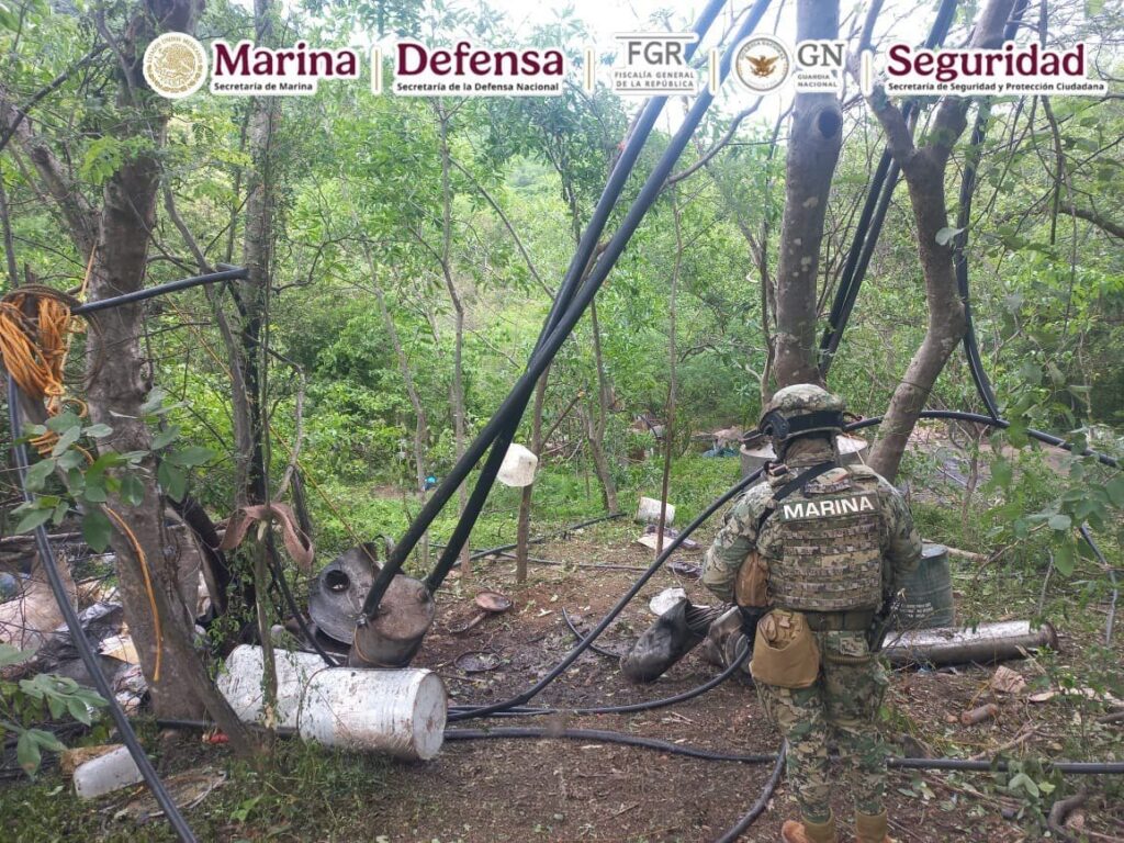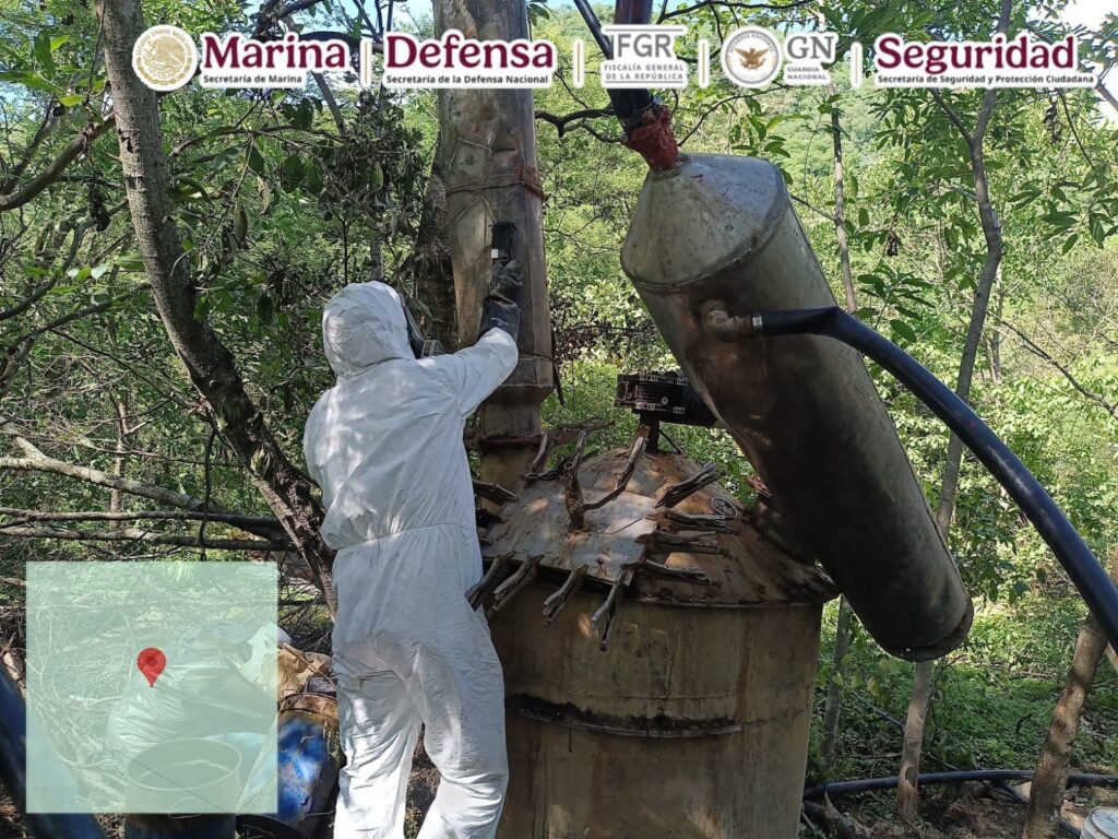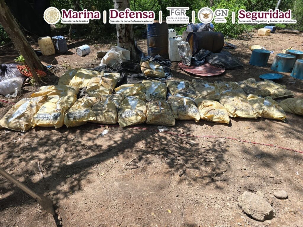 Esta acción se llevó a cabo durante recorridos de reconocimiento terrestre, cuando personal naval localizó y desmanteló dos laboratorios clandestinos. En el lugar se aseguraron aproximadamente 21,000 kilogramos de metanfetamina ya procesada, así como diversos precursores químicos, entre ellos: 1,000 litros de ácido clorhídrico, 200 litros de ácido acético, 1,000 litros de tolueno, 200 litros de cianuro de bencilo, 250 litros de P2P, 575 kilogramos de sosa cáustica y 200 kilogramos de cianuro de sodio.