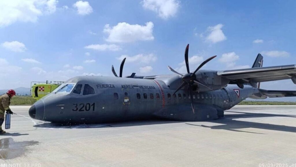 Aeronave militar sufre fallo del tren de aterrizaje en la Base Aérea Militar No. 1, Santa Lucía, Edo. Méx.