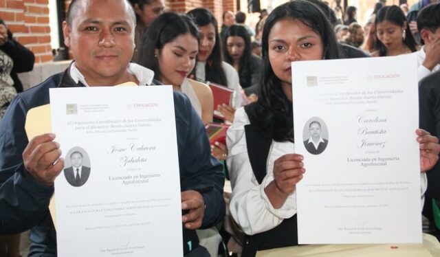Delgado Carrillo dijo que, en el estado de Puebla, 54 egresados de la sede de Cuetzalan recibieron su título, al igual que 52 del plantel de Chignautla y 62 de la unidad de Chiautzingo. Con este documento, las y los jóvenes podrán acreditar sus estudios y facilitar su incorporación al mercado laboral.
