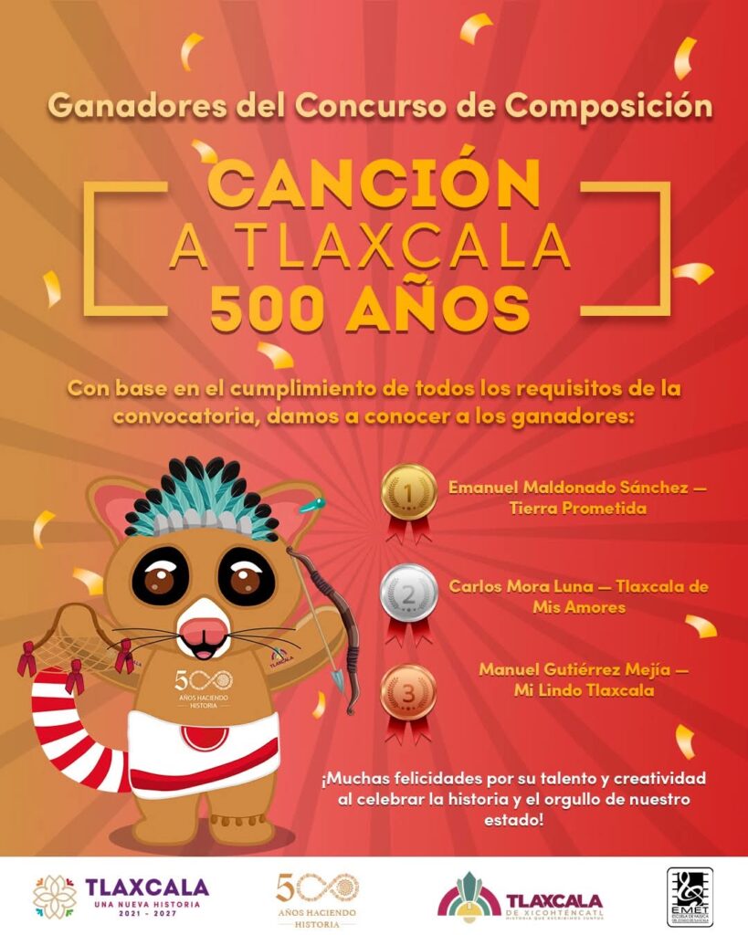 La Secretaría de Cultura del Estado de Tlaxcala anunció a los ganadores del Concurso de Composición “Canción a Tlaxcala 500 Años”, certamen convocado en el marco de las celebraciones por el medio milenio de la fundación de la ciudad capital.