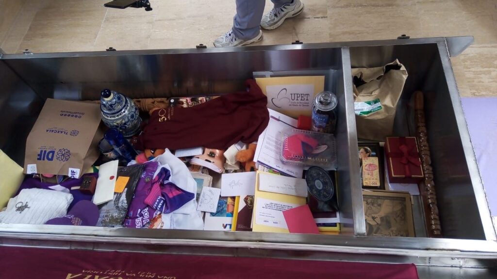 • Entre los elementos depositados en la cápsula se incluyen cartas manuscritas dirigidas a los ciudadanos de 2075, elaboradas por la UPET, autoridades como la gobernadora Lorena Cuéllar Cisneros, el TSJE, el obispo de Tlaxcala, académicos, cronistas y representantes de grupos prioritarios (mujeres, indígenas, personas con discapacidad y comunidad LGBT+), unos guantes de plata depositados por el hijo del ex boxeador internacional Mauro Vázquez, y una memoria USB con poesía y crónicas en náhuatl, entre otros objetos.